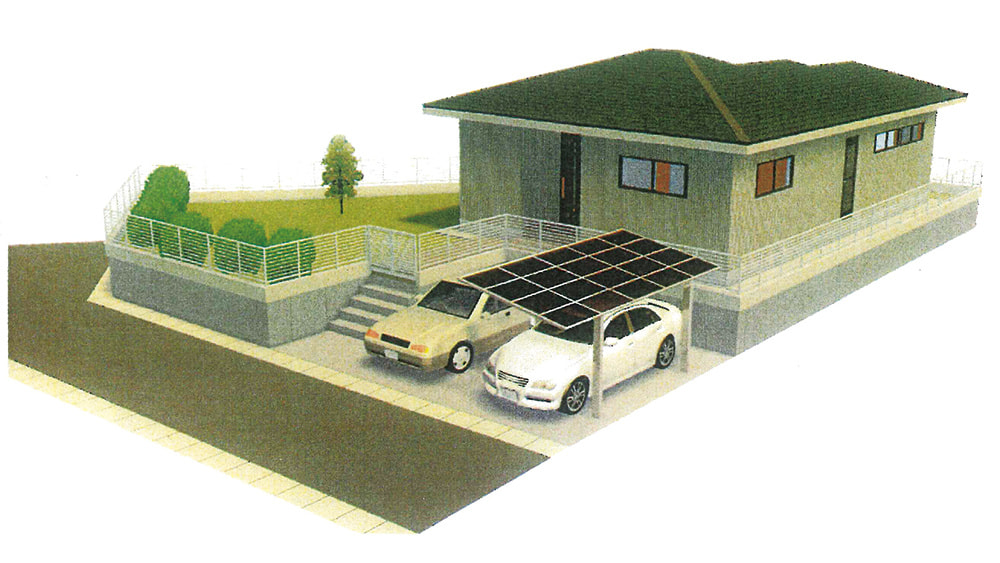 宅地部分が道路より少し上がっているので下の例のように、建物まで道路から斜めにスロープをつけたイメージになります。