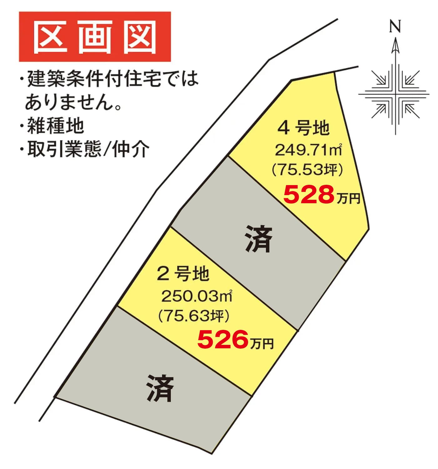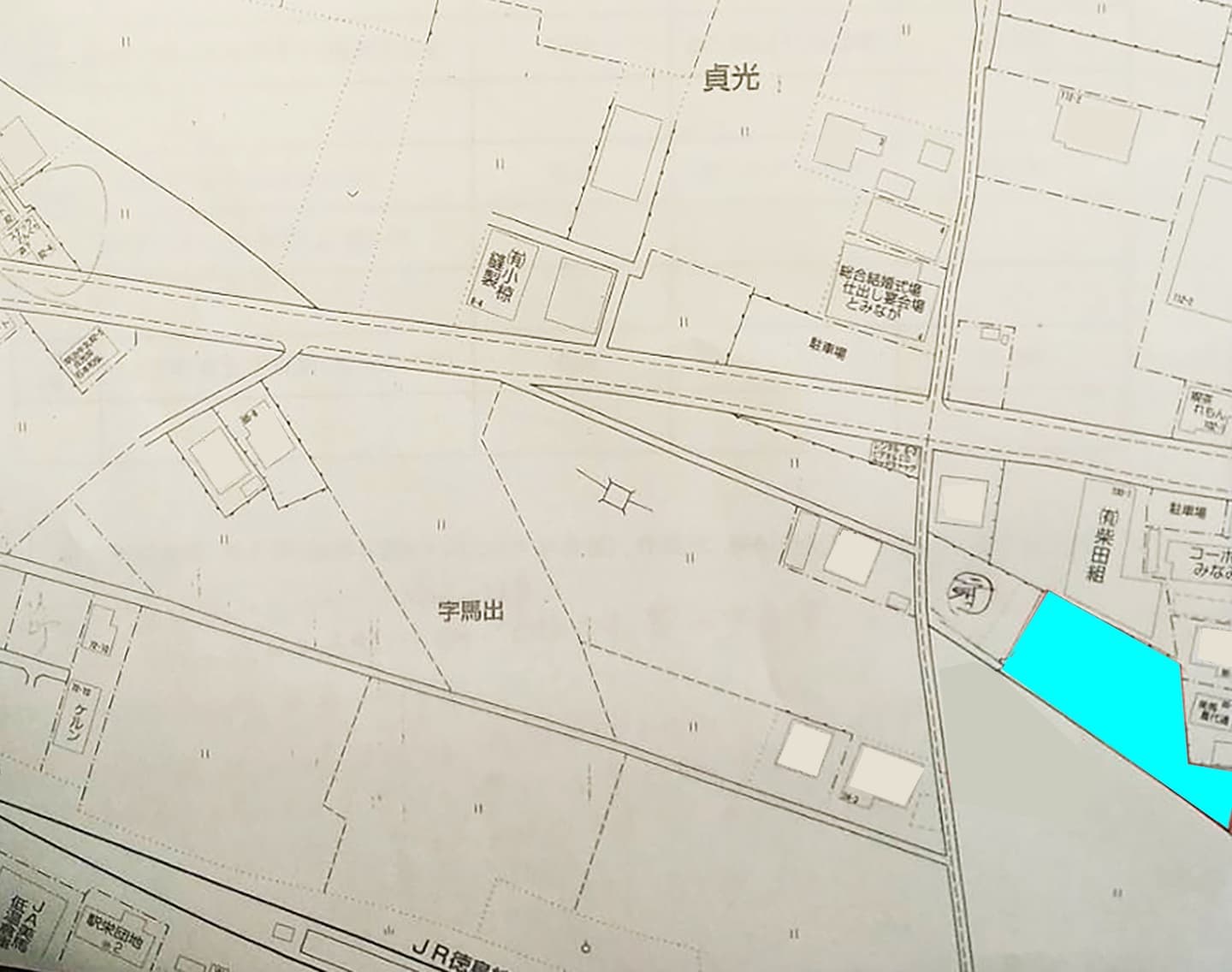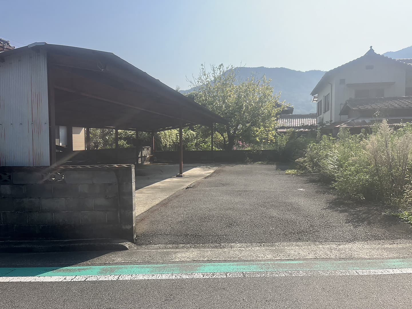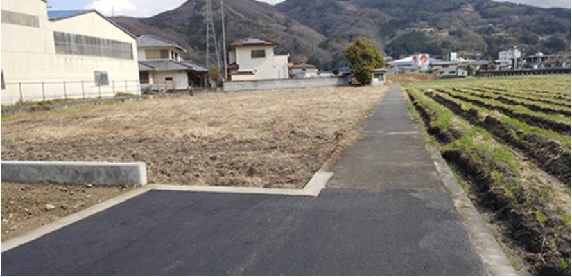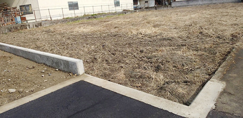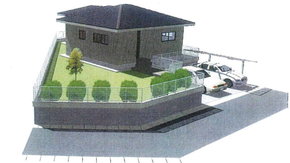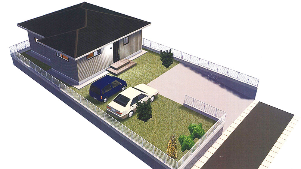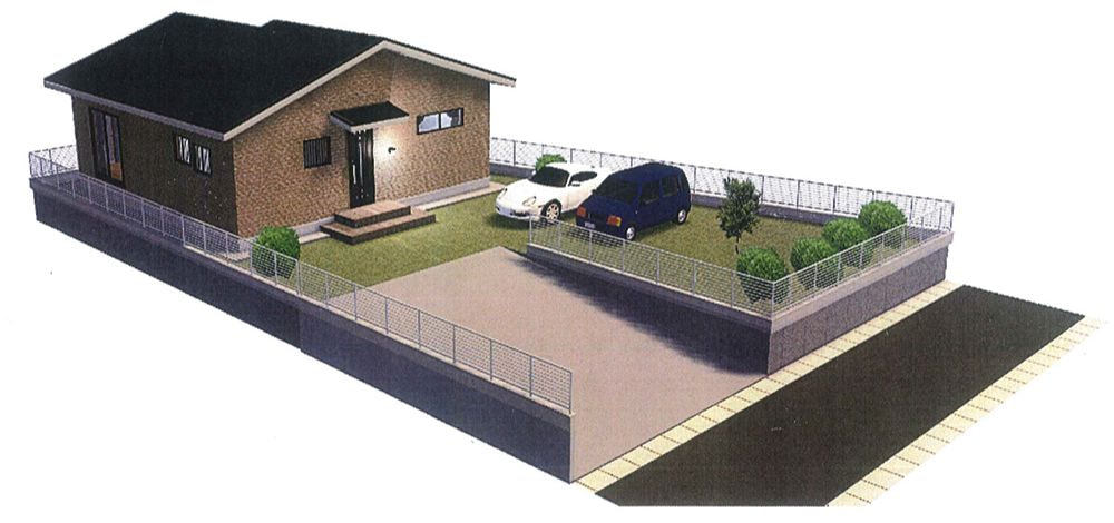 宅地部分が道路より少し上がっているので下の例のように、建物まで道路から斜めにスロープをつけたイメージになります。